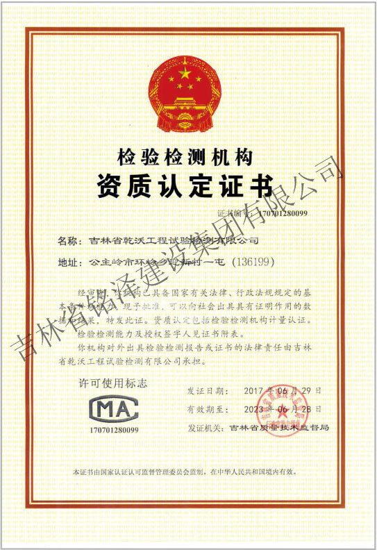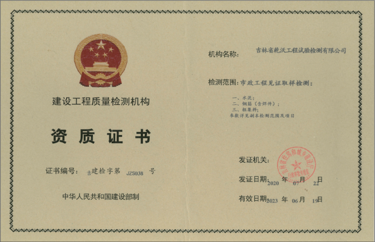 吉林省乾沃工程试验检测有限公司于2016年11月成立,注册资金1250万元,是一家具有独立法人资格并通过吉林省CMA计量认证的专业试验检测公司。现有人员20余人,其中高级工程师1人,工程师3人,技术人员20余人,所有试验检测人员均通过了吉林省建设工程质量监督检测协会的考核,取得市政建设工程材料检测资格并持证上岗。
